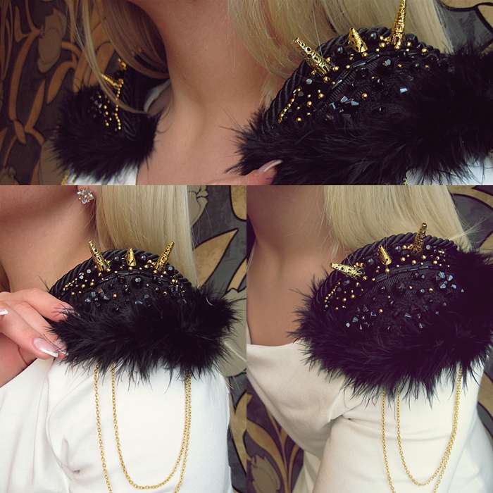 Ādas ielaidumi, peplum topi. Garie cimdi līdz elkoņiem.